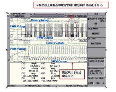 接著再次迅速提高盤式液壓,通過ABS傳動裝置增加制動力。換句話說,可通過增減盤式液壓防止制動器被鎖上。增加盤式液壓也就是用泵將液體壓入汽缸,會使泵馬達(dá)迅速工作。這個快速的馬達(dá)將影響控制螺旋管閥門的PWM電流信號。一般ABS操作無法得到這是否影響電池電壓波動。因此,有必要觀察這個電池電壓波動。