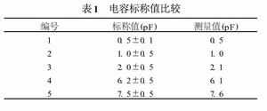 現(xiàn)對5個(gè)標(biāo)稱值已知的片式電容在300M~3000MHz的頻率范圍內(nèi)測量,所得數(shù)據(jù)與生產(chǎn)廠家給出的電容標(biāo)稱值進(jìn)行比較,如表1所示。