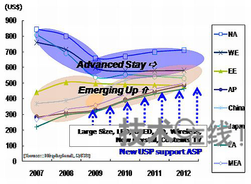 【4】分地區(qū)電視平均銷售價格展望 分地區(qū)看電視的平均銷售價格(ASP)變化可預測,發(fā)達國家市場的ASP暴跌將告一段落,而在新興市場國家,隨著FPD電視的增加和屏幕大型化,ASP將會繼續(xù)上漲。另外,估計LED背照燈液晶電視、3D電視、IPTV及無線功能等的普及也會成為推高ASP的因素。
