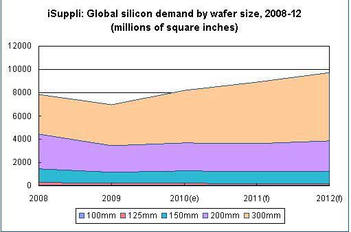 iSuppli:2008年至2012年,全球不同尺寸半導(dǎo)體硅片市場需求量狀況