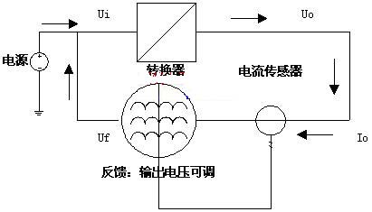 在能量反饋部分就要能實現(xiàn)上述要求,保證穩(wěn)定的電能轉(zhuǎn)換器的輸出電流,采用電流傳感器檢測電能轉(zhuǎn)換器的輸出電流,同時反饋部分采用反饋電壓與輸出控制電流之間成反比系數(shù)關(guān)系即Uf∝K/Io,為便于分析,設(shè)電源電壓Ui為穩(wěn)定值。當輸出電流較小時,通過調(diào)節(jié)反饋電壓,使其變大,則反饋電壓與輸入的電壓差△U=Uf-Ui變大,相應(yīng)的由反饋電壓流向輸入電壓的電流加大,造成相應(yīng)的反饋功率加大;當輸出電流較大時,通過調(diào)節(jié)反饋電壓,使Uf變小,則反饋電壓與輸入的電壓差△U變小,相應(yīng)的由反饋電壓流向輸入電壓的電流減小,造成循環(huán)的功率減??;整個過程維持負反饋控制,最終達到動態(tài)平衡,維持設(shè)定的額定功率。