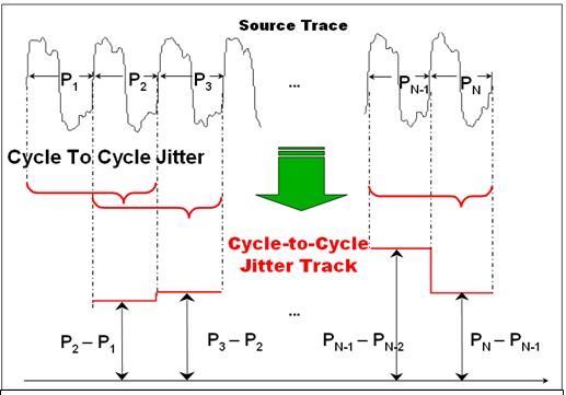 相鄰周期抖動(dòng)(Cycle to cycle jitter)是時(shí)鐘相鄰周期的周期差值進(jìn)行統(tǒng)計(jì)與測(cè)量的結(jié)果。如圖4所示,后一時(shí)鐘周期減去前一時(shí)鐘后作為統(tǒng)計(jì)的樣本,C1=P2-P1, C2=P3-P2, Cn-1 = Pn - Pn-1,把C1到Cn-1進(jìn)行數(shù)理統(tǒng)計(jì),同理,可以計(jì)算出Cycle to cycle jitter的峰峰值和RMS值。