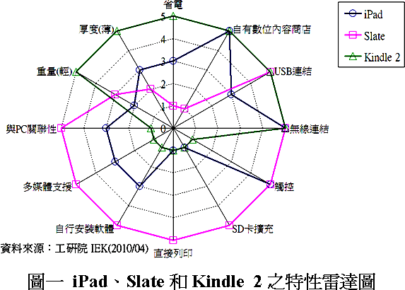 工研院IEK進(jìn)行iPad、Slate和Kindle 2三種產(chǎn)品有關(guān)省電、自有數(shù)位內(nèi)容商店、USB連結(jié)、無線連結(jié)、觸控、SD卡擴(kuò)充、直接列印、自行安裝軟體、多媒體支援、與PC關(guān)聯(lián)性、重量(輕)和厚度(薄)等特性的競比,1分代表不具有其特性,為最低比重,分?jǐn)?shù)越高代表與此特性關(guān)聯(lián)性越強(qiáng),完全相關(guān)聯(lián)為最高5分,將其結(jié)果繪制成雷達(dá)圖(圖一)表示。