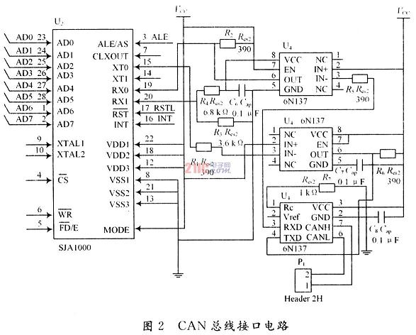 選用芯片82C250作為CAN控制器和物理總線間的驅(qū)動接口,可以提供對總線的差動發(fā)送能力和對CAN控制器的差動接收能力,其最高速可達(dá)1Mb/s。由于實(shí)際系統(tǒng)中存在干擾,故增加高速光隔6N137,以起到隔離的作用。電氣接口很簡單,有CANH和CANL兩根線,用以完成CAN的數(shù)據(jù)傳輸。在CAN總線的兩端有一個120Ω的電阻,其作用為匹配總線阻抗,用于提高數(shù)據(jù)通信的抗干擾性及可靠性。具體電路如圖2所示。