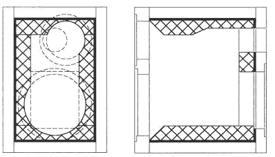 本音箱的箱體制作比較簡(jiǎn)單,只需按圖6所示將.6塊具有相應(yīng)開口的箱板緊固在一起即可,無需使用加強(qiáng)板或支柱。高音單元裝在偏離面板中央的位置和前面板兩側(cè)倒成圓角是為了獲得正確輻射方向因而采取的措施。此外,與通常的做法相比,低音反射口不是位于前面板而是位于箱體背后。該反射口內(nèi)接的出聲管可用直徑35mm、長(zhǎng)123mm稍具錐度的聚氯乙烯塑料管制成。