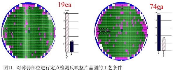 最終的實(shí)驗(yàn)證明自動(dòng)工藝檢測結(jié)果與最終良率的對(duì)應(yīng)關(guān)系。表明自動(dòng)工藝檢測可以反映存儲(chǔ)單元內(nèi)接觸孔通孔刻蝕的狀態(tài)。對(duì)于在生產(chǎn)線上檢驗(yàn)到薄弱部位有刻蝕不完全比較多的晶圓,其對(duì)應(yīng)的正常存儲(chǔ)單元內(nèi)也有較多的接觸孔有刻蝕不完全問題??梢酝ㄟ^對(duì)產(chǎn)品的薄弱部位進(jìn)行監(jiān)測達(dá)到對(duì)正常存儲(chǔ)單元內(nèi)接觸孔刻蝕狀態(tài)的實(shí)時(shí)反映,這對(duì)接觸孔的刻蝕工藝改進(jìn)有極大的促進(jìn)作用(如圖11所示)。