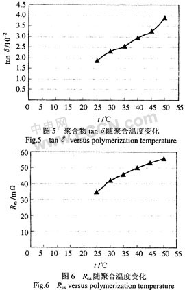 (2)聚合溫度對(duì)電容器的tanδ和Res有較大影響。電容器的tanδ和Res隨反應(yīng)溫度增加而增大,最佳聚合反應(yīng)溫度為25℃。