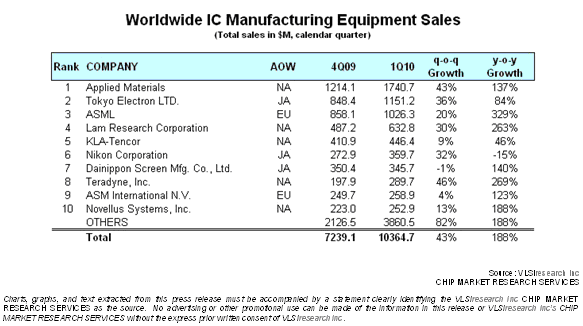 在VLSI 7月初發(fā)布的2010年Q1半導(dǎo)體設(shè)備公司銷售統(tǒng)計(jì)中,中小公司的業(yè)績(jī)?cè)龇_(dá)到了82%。由于SOC測(cè)試的增長(zhǎng),Teradyne以46%的季度增幅列前10名設(shè)備公司增幅榜首。穩(wěn)居業(yè)界老大寶座的Applied Materials增幅與整個(gè)業(yè)界持平,為43%。半導(dǎo)體設(shè)備Q1的總銷售額達(dá)到了104億美元,面對(duì)市場(chǎng)的普遍反彈,業(yè)界一片歡呼。相信下周 SEMICON West的party也將成為普天同慶的盛會(huì)。