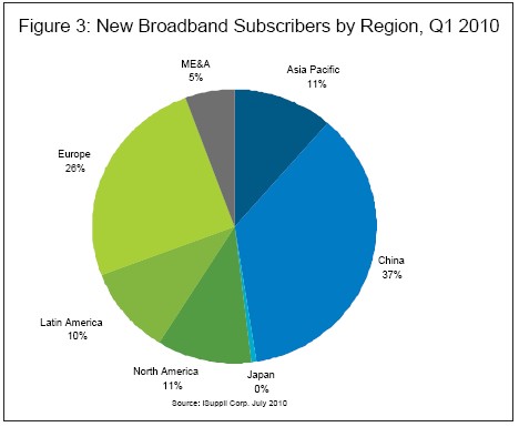 圖3所示為iSuppli公司對(duì)2010年第一季度寬帶用戶增長(zhǎng)情況的預(yù)估,按地區(qū)細(xì)分。