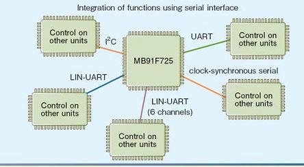 車用MCU連接的外圍相當(dāng)多樣,而連接的接口可能是UART、頻率同步串行、LIN-UART和I2C,因此必須具備彈性的接口連接能力。為了滿足此需求,富士通將內(nèi)置式多功能串行接口用作串行通信接口,并透過(guò)軟件方式來(lái)切換上述各種接口,以靈活支持外部組件的通信規(guī)范,并提高系統(tǒng)設(shè)計(jì)的自由度。新系列MCU還提供LIN-UART的6條通道,從而能夠與更多控制單元進(jìn)行通信;其中MB91725系列因具有定時(shí)器功能的多條信道和A/D轉(zhuǎn)換器,更容易達(dá)成各種功能的整合。請(qǐng)參考(圖二)。