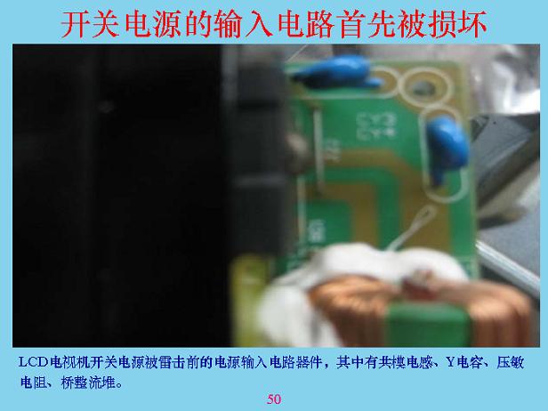 下面我們講一些具體的。這是一個(gè)開(kāi)關(guān)電源,開(kāi)關(guān)電源被雷劈的時(shí)候,輸入回路基本上都燒了,假如沒(méi)燒是什么樣的?可以看看,這是橋堆,這兩個(gè)是Y電容,這里面還有一個(gè)壓敏電阻。這是共模線圈,雷劈以后全部燒了,說(shuō)明壓敏電阻沒(méi)有起到什么保護(hù)作用,兩個(gè)電容都燒了,說(shuō)明電感相當(dāng)、相當(dāng)?shù)馗?。為了防止雷電,首先前面一定要加一個(gè)能量吸收,比較大的東西,成本相對(duì)來(lái)說(shuō)比較低,像試驗(yàn)站里面的放電裝置,那個(gè)東西沒(méi)有地方裝,也貴得很。在硬紙板上面排幾個(gè)鋸齒,中間隔一個(gè)頭就行了。如果中間隔6mm也可以。有一個(gè)一級(jí)電感,電感可以使瞬間上去很快的電壓降下來(lái),突然加一個(gè)1萬(wàn)伏、10萬(wàn)伏,加上去只有這兩端,另外兩端建立不起來(lái),所以剛加進(jìn)去的時(shí)候?qū)纂妬?lái)說(shuō),大部分能量都被吸收掉了。后面經(jīng)過(guò)這個(gè)以后,剩余部分通過(guò)共膜電容繼續(xù)吸收,吸收完以后還有差模部分,產(chǎn)生的差模部分通過(guò)電容把差模吸收掉。共模電容和差模電容具有抑制傳導(dǎo)干擾的作用,對(duì)雷電也有抑制作用,所以很多人也在問(wèn),電容接到前面好還是接在后面好?這個(gè)東西看你有什么作用,如果只是為了防EMI電磁干擾的話,接在越前面越好,接在測(cè)試儀表的輸入端最好,接到那里把信號(hào)全部短路掉了,就看不到了。但是對(duì)于雷電,你接到后面要好很多,所以這主要是防雷的,你就不要考慮電磁干擾和EMC了,盡量把兩個(gè)放在后面。