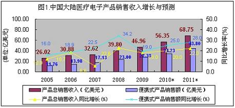 據(jù)統(tǒng)計分析,2009年中國大陸醫(yī)療電子本地產(chǎn)品銷售額比2008年增長18%,接近47億美元,其中便攜式醫(yī)療電子銷售額同比增長19%,達到27.38億美元。預計2010年醫(yī)療電子銷售額將繼續(xù)高速增長,超過56億美元。其中便攜式醫(yī)療電子產(chǎn)品銷售額可超過34億美元。從2005~2009年中國大陸醫(yī)療電子產(chǎn)品總銷售額的年復合增長率達15.9%,其中便攜式產(chǎn)品的年復合增長率達23.5%(見下圖)。