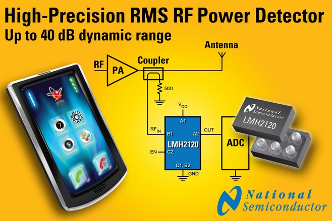 LMH2120線性均方根射頻功率檢波器只需一個單一的2.7V至5V的電源即可正常工作,輸出電壓與以dBm為計量單位的射頻輸入功率成正比。因此無需額外校準,而且還可以在系統(tǒng)內采用較低分辨率的模擬/數(shù)字轉換器。手機設計工程師可以利用定向耦合器或阻性分接頭將LMH2120芯片連接至功率放大器的輸出端。