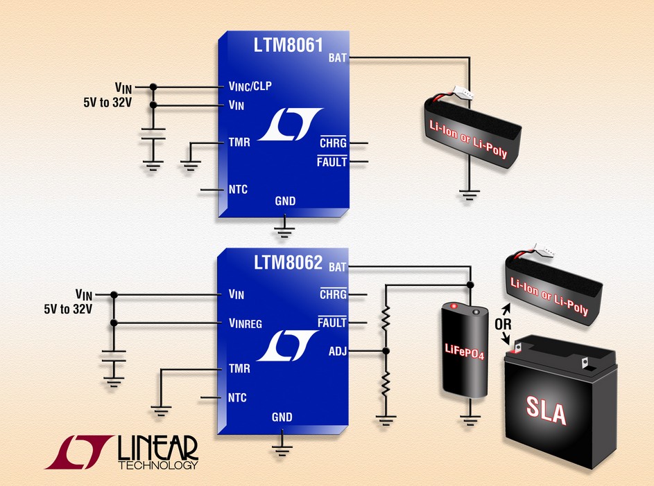 為了保持電池處于滿充電狀態(tài),一旦電池電壓降至比浮置電壓低 2.5% 時(shí),LTM8061 和 LTM8062 就自動(dòng)啟動(dòng)再充電周期。安全功能包括壞電池檢測(cè)和具故障指示并適用于 LED 的 NTC 電阻器輸入。當(dāng)電源不存在時(shí),內(nèi)部輸入反向電壓隔離二極管可用來(lái)防止電池的泄漏電流。LTM8061 和 LTM8062 采用 RoHS 兼容的 9mm x 15mm x 4.32mm LGA 封裝,千片批購(gòu)價(jià)分別為每片 8.85 美元和 9.85 美元。