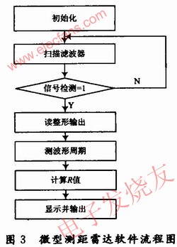 雷達(dá)工作時(shí),單片機(jī)控制窄帶濾波器不斷的進(jìn)行掃描,當(dāng)某一個(gè)濾波器有信號(hào)時(shí),由可重觸發(fā)單穩(wěn)態(tài)電路組成的信號(hào)檢測(cè)電路輸出由“0”變?yōu)?ldquo;1”,單片機(jī)根據(jù)輸出的窄帶濾波器獲得帶內(nèi)頻率,判斷出精度不太高的距離范圍,利用放大整形輸出進(jìn)行計(jì)數(shù)或測(cè)量脈沖的周期,獲得足夠精確的頻率值,即為準(zhǔn)確距離。根據(jù)公式計(jì)算出R和V送顯示器予以顯示,或通過RS232串口送上一級(jí)的計(jì)算機(jī)系統(tǒng)。