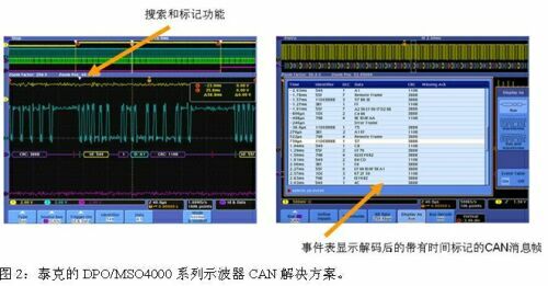 對(duì)于汽車(chē)中常用的CAN、LIN這類(lèi)低速串行總線的調(diào)試,泰克的DPO/MSO4000系列示波器提供了簡(jiǎn)單、易用、完整、高品質(zhì)的觸發(fā)、捕獲和解碼解決方案。如圖2,該示波器系列提供了搜索和標(biāo)記功能,可在事件表顯示解碼后的帶有時(shí)間標(biāo)記的CAN消息幀,這一功能是其他競(jìng)爭(zhēng)性產(chǎn)品所不具備的。