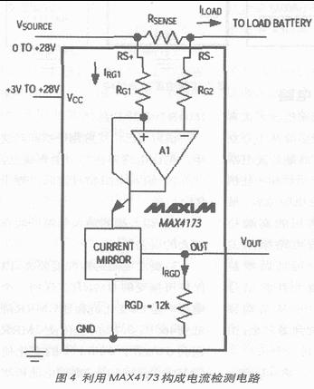MAXIM推出了一系列雙向或單向電流檢測IC,有些雙向電流檢測IC內(nèi)置檢流電阻,可檢測流入或流出被檢電路的電流大小并通過一個(gè)極性指示引腳顯示電流方向。增益可調(diào)的電流檢測IC、固定增益(+20V/V,+50V/V,或+100V/V)電流檢測芯片或包括單雙比較器的固定增益電流檢測IC,都采用小體積封裝,如SOT23,可滿足對(duì)尺寸要求苛刻的應(yīng)用。圖4是用MAX4173構(gòu)成的高端電流檢測電路。[page]