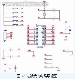 1、由單片機(jī)SPMC65P2404A控制的電飯煲的硬件原理圖如圖3-1所示,它包括按鍵輸進(jìn)部分,溫度檢測(cè)輸進(jìn)電路,復(fù)位和晶振電路,PA6、PA7完成對(duì)頂蓋和底盤的溫度的檢測(cè),PA5完成對(duì)繼電器的控制,SPMC65P2404A是系統(tǒng)的核心部分。