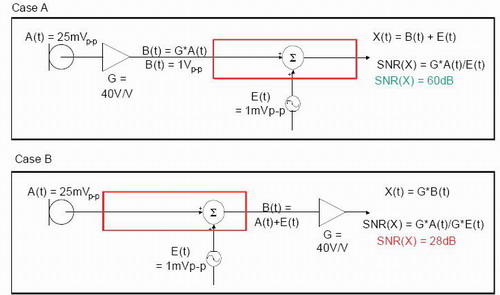 圖1:放大器位于不同位置將產(chǎn)生不同的信噪比。