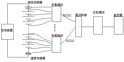 在電力系統(tǒng)變電站目前使用較多的蓄電池在線監(jiān)測裝置是電池巡檢儀,電池巡檢儀又分為兩種,一種是測量蓄電池單體電壓的巡檢儀,結(jié)構(gòu)是由一個主控模塊和數(shù)個采集模塊組成,主模塊接收監(jiān)控器的命令,發(fā)送電池數(shù)據(jù)到直流設(shè)備的監(jiān)控器;采集模塊中每個模塊采集10~20節(jié)電池的電壓、電流和溫度;通過直流充電設(shè)備的監(jiān)控器可顯示各單節(jié)電池電壓,判斷故障電池的編號且給出報警。這類電池巡監(jiān)儀一般由直流設(shè)備生產(chǎn)廠家提供,在訂貨直流設(shè)備時它是選配裝置,由于功能單一、不能測試容量、且測量精度差、容易誤報,限制了它的廣泛使用。測試示意圖如圖1: