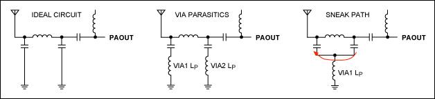 寄生電感往往對(duì)旁路電容的連接影響很大。理想的旁路電容在電源層與地層之間提供高頻短路,但是,非理想過孔則會(huì)影響地層和電源層之間的低感通路。典型的PCB過孔(d = 10 mil、h = 62.5 mil)大約等效于一個(gè)1.34nH電感。給定ISM-RF產(chǎn)品的特定工作頻率,過孔會(huì)對(duì)敏感電路(例如,諧振槽路、濾波器以及匹配網(wǎng)絡(luò)等)造成不良影響。