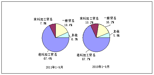 加工貿(mào)易出口比重下滑。1-9月,來(lái)、進(jìn)料加工貿(mào)易出口額分別為381和3241億美元,同比增長(zhǎng)-10.7%和13.9%,增速低于行業(yè)平均水平25.1和0.5個(gè)百分點(diǎn),加工貿(mào)易出口比重為75.4%,比去年同期下降2.5個(gè)百分點(diǎn)。9月份,來(lái)料加工出口下降21.0%,進(jìn)料加工出口增長(zhǎng)8.8%。