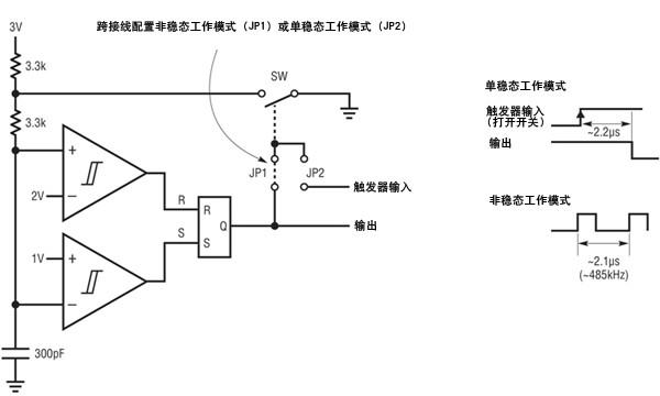 面對(duì)電容器受到的實(shí)際限制,電阻器的選擇變得更加關(guān)鍵了,不過電阻器也受到一些限制。如果 RC 電路的電阻非常小,就會(huì)產(chǎn)生功耗后果,因?yàn)榇罅抗β世速M(fèi)在電阻器上了。例如,圖 2 中的 RC 電路吸取超過 1mA 的峰值電流,而且在非穩(wěn)態(tài)工作 (振蕩器) 模式時(shí),兩個(gè)外部電阻器本身就吸取了 450uA 的平均電流1。另一方面,表面泄漏和輸入偏置電流會(huì)限制最大電阻值。在有幾 nA 的雜散或偏置電流時(shí),超過 10MΩ 的電阻器就會(huì)因?yàn)檫@些電流產(chǎn)生可觀的誤差。