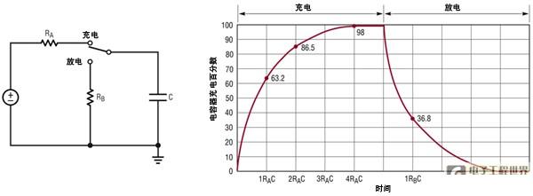 也許最簡(jiǎn)單、最常見的電子電路是電阻器和電容器串聯(lián)后連接到地所形成的電路。如圖 1 所示,當(dāng)電壓加在電阻器上時(shí),電容器上的電壓響應(yīng)會(huì)呈現(xiàn)指數(shù)規(guī)律:VC = VR (1-e-t/),當(dāng)電阻器接地時(shí),電容器上的電壓響應(yīng)會(huì)呈現(xiàn)類似但反向的指數(shù)規(guī)律:VC = VINITIAL(e-t/)。這種簡(jiǎn)單和可預(yù)測(cè)的時(shí)間響應(yīng)使這種電路成為濾除噪聲、降低快速信號(hào)邊沿速度、保護(hù)設(shè)備輸入、避免競(jìng)態(tài)情況以及解決其他無數(shù)定時(shí)問題的理想解決方案。即使沒有給電路添加電阻器或電容器,由于走線或連線中的電阻,這種電路實(shí)際上也常常存在。