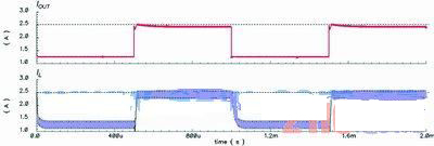 為了說明這個(gè)方案,圖1中的降壓轉(zhuǎn)換器會(huì)采用這些配置:L=20mH、COUT=47mF、RL值在2.64W(正常模式)~1.1W(電流限制模式)間轉(zhuǎn)換,并會(huì)使用一個(gè)tD=100ns的比較器,而IOUT(CL,DES)和IL(RIPPLE)分別是2.5A和0.3A。不過,如果使用傳統(tǒng)的峰值電流限制方法,那么式(1)中的IV便會(huì)設(shè)定為2.35A,傳統(tǒng)方法的模擬結(jié)果如圖4所示。由此可以看到,IOUT(CL)會(huì)由于tD的影響而低于2.5A。然而,使用新方法并將ILR設(shè)定在2.5A,IOUT(CL)便可如圖5所示達(dá)到2.5A。于是,傳統(tǒng)方法中出現(xiàn)的問題便能夠在該方案中解決。