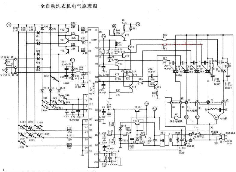 全自動(dòng)洗衣機(jī)由洗衣系統(tǒng)和控制電路組成。其控制電路分為機(jī)械和電腦型,電腦型控制電路是以單片機(jī)作為控制電路的核心。圖1給出單片機(jī)Z86C09組成的全自動(dòng)洗衣機(jī)的控制電路。