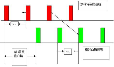在打開第一個(gè)電磁閥間隔1s后打開第二個(gè)電磁閥。如此則在落料桶內(nèi)同時(shí)有兩包料,必須保證在后續(xù)的熱封電子凸輪運(yùn)行周期此完全吻合才能確保無誤,如圖5所示。