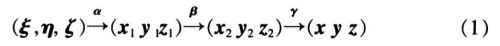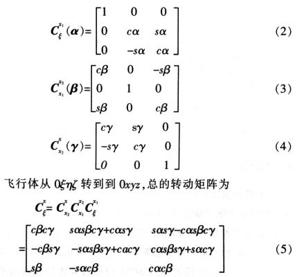 在對(duì)剛體的轉(zhuǎn)動(dòng)運(yùn)動(dòng)進(jìn)行解析描述時(shí).常應(yīng)用歐拉角或卡爾丹角??柕そ沁m用于姿態(tài)角變化較小的場(chǎng)合,因此.用卡爾丹角進(jìn)行描述。取初始時(shí)刻飛行體坐標(biāo)系Oξηζ為固定坐標(biāo)系,0xyz為與飛行體固結(jié)的動(dòng)坐標(biāo)系??柕そ沁x取的方法是,首先繞ξ軸轉(zhuǎn)過(guò)α角,到達(dá)0x1y1zl的位置;再繞y1軸轉(zhuǎn)動(dòng)β角,到達(dá)0x2y2z2的位置;再繞z2軸轉(zhuǎn)動(dòng)γ角,到達(dá)0xyz的位置。轉(zhuǎn)動(dòng)關(guān)系如圖l所示。
