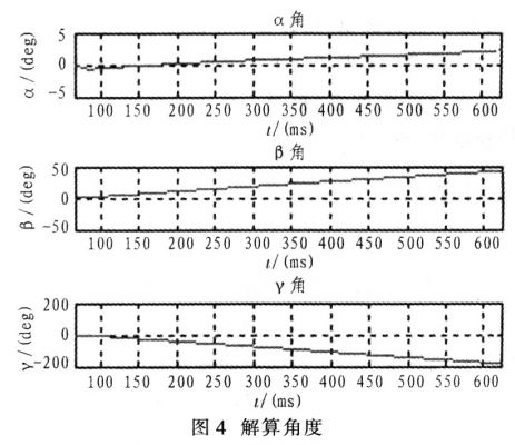 陀螺儀測(cè)得的ωx、ωy以及ωz已知,根據(jù)表達(dá)式7所示的運(yùn)動(dòng)學(xué)微分方程,在MATLAB下解算出角度,如圖4所示。經(jīng)對(duì)比,與高速攝影記錄的姿態(tài)非常吻合。
