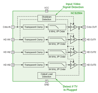 視頻信號(hào)放大器包括NCS2566、NCS2564、NCS2584、NCS2563、NCS2553、NCS2561、NE592x8和NE592x14等。圖1是NCS2584的框圖,可以看到,其關(guān)斷檢測(cè)用來(lái)進(jìn)行輸入視頻信號(hào)檢測(cè),輸出負(fù)載檢測(cè)用來(lái)檢測(cè)是否有電視接上插座。