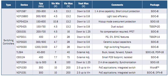 安森美半導(dǎo)體的開(kāi)關(guān)控制器的關(guān)鍵特性包括寬輸入電壓范圍、緩沖的外部高于1.25 V的電壓參考、電源良好+啟用/禁用引腳、外部同步和輸出過(guò)壓和欠壓保護(hù)。根據(jù)型號(hào)不同,具有支持短路保護(hù)、高輕載能效、斷續(xù)(hiccup)模式過(guò)流保護(hù)、雙輸出、無(wú)需補(bǔ)償、PG/EN/SYNC功能、使用陶瓷輸出電容、高開(kāi)關(guān)頻率、降壓/升壓/正前/反激、支持小PCB面積、支持隔離、PoE應(yīng)用、集成開(kāi)關(guān)等特性,詳見(jiàn)下表。