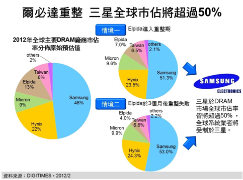 DIGITIMES Research分析師柴煥欣分析,受DRAM價格自2011年第1季持續(xù)性下滑影響,加上日圓匯率亦持續(xù)升值加重成本負擔(dān),全球第3大DRAM供貨商爾必達(Elpida)在歷經(jīng)連續(xù)5季虧損后,終于無法支撐,于2012年2月27日無預(yù)警申請破產(chǎn)保護,并將進行重整。