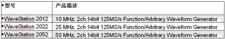 力科公司日前宣布發(fā)布WaveStationTM 系列函數(shù)/任意波形發(fā)生器。WaveStation最高信號生成頻率50MHz,提供3.5”大屏幕顯示,直觀的人機交互界面,全系標配雙通道輸出和PC端波形編輯功能。WaveStation系列包含三款型號,帶寬分別為10 MHz, 25 MHz和50 MHz;采樣率125MS/s,14-bit分辨率,每通道16Kpts存儲深度。WaveStation除擁有基本函數(shù)波形:正弦、方波、斜坡、脈沖和噪聲等信號之外,還內(nèi)置了超過40種任意波形函數(shù)庫。創(chuàng)新的3.5”彩色顯示屏方便將預覽波形和波形參數(shù)同時顯示,如頻率、幅值、偏置和相位等。WaveStation提供了多種調(diào)制模式:AM, PM, FM, ASK, PSK, FSK和PWM,可以通過前面板直接編輯。儀器提供了必需的I/O接口方便與其他設備同步,同時提供標準USB和GPIB接口用于遠程控制和自動化編程,WaveStation的發(fā)布定位于強大,靈活的波形生成能力。
