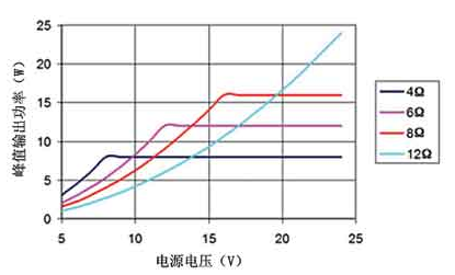 D 類放大器MOSFET輸出級的導(dǎo)通電阻會影響它的效率和峰值電流能力。降低負(fù)載的峰值電流可減少MOSFET的I2R損耗,進(jìn)而提高效率。要降低峰值電流,應(yīng)在保證輸出功率, D類放大器的電壓擺幅以及電源電壓的限制的條件下,選擇最大阻抗的揚聲器,如圖4所示。本例中,假設(shè)D類放大器的輸出電流為2A,電源電壓范圍為 5~24V。電源電壓大于等于8V時,4Ω的負(fù)載電流將達(dá)到2A,相應(yīng)的最大連續(xù)輸出功率為8W。如果8W的輸出功率能滿足要求,則可以考慮使用一個 12Ω揚聲器和15V供電電壓,此時的峰值電流限制在1.25A,對應(yīng)的最大連續(xù)輸出功率為9.4W。此外,12Ω負(fù)載的工作效率要比4Ω負(fù)載的高出 10%~15%。實際效率的提高根據(jù)不同D類放大器而異。雖然大多數(shù)揚聲器的阻抗都采用4Ω或8Ω,但也可采用其他阻抗的揚聲器實現(xiàn)更高效的散熱。
