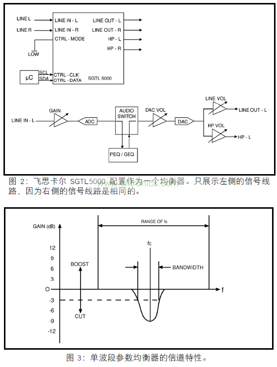 來自飛思卡爾半導體的 SGTL5000 編解碼器,提供了增強音頻功能的不同選擇。圖 2 顯示了使用設(shè)備均衡塊的應(yīng)用,可以作為音調(diào)控制器,七波段參數(shù)均衡器或五波段圖形均衡器。
