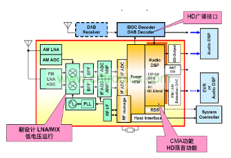 圖4是安森美半導(dǎo)體DSP調(diào)諧器的框圖。從圖中可以看出,模擬前端是新設(shè)計(jì)的新設(shè)計(jì)LNA和MIX,可低電壓運(yùn)行,只需5 V供電;數(shù)字后端可以支持廣播接口。DSP采用CMA算法,具有HD混音功能。