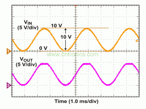 為了測(cè)試該電路,我們將VCC/2 = 5V DC偏移的300 Hz正弦波應(yīng)用于輸入端。在VOUT出現(xiàn)變化以前,一直對(duì)AC幅值進(jìn)行調(diào)節(jié)。如圖4所示,當(dāng)應(yīng)用10 Vp-p輸入時(shí),VOUT在正軌附近出現(xiàn)一個(gè)經(jīng)削波的信號(hào),而非負(fù)軌附近。如果輸入超出VCC – 0.8V(本例中為9.2V),這種正軌附近出現(xiàn)的非理想行為是我們能夠預(yù)計(jì)到的。9.2V以下VIN電平和低至0V時(shí),VOUT顯示出正確的波形,正如我們所預(yù)期的那樣。