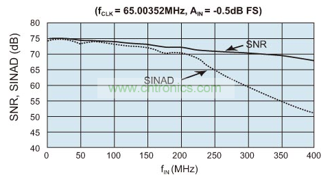 圖1:MAX12559在96MHz時(shí)鐘頻率、-1dBFS輸入時(shí),SNR和SINAD與輸入頻率的對應(yīng)關(guān)系曲線。