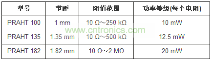 PRAHT系列的節(jié)距為1mm、1.35mm或1.82mm,阻值為10?~2M?,每個電阻的功率等級為10mW~20mW。器件具有小于-35dB的低噪聲,電壓系數(shù)小于0.01ppm/V。符合RoHS的電阻網(wǎng)絡(luò)提供工作溫度可達(dá)+230℃的金端接,或溫度為+200℃的SnAg端接。