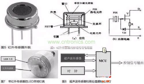 被動式紅外傳感器有三個關鍵性的元件:菲涅爾濾光透鏡,熱釋電紅外傳感器和匹配低噪放大器。菲涅爾透鏡有兩個作用:一是聚焦作用,即將熱釋紅外信號折射在PIR上:二是將探測區(qū)內分為若干個明區(qū)和暗區(qū),使進入探測區(qū)的移動物體/人能以溫度變化的形式在PIR上產生變化的熱釋紅外信號。一般還會匹配低噪放大器,當探測器上的環(huán)境溫度上升,尤其是接近人體正常體溫(37℃)時,傳感器的靈敏度下降,經由它對增益進行補償,增加其靈敏度。輸出信號可用來驅動電子開關,實現(xiàn)LED照明電路的開關控制。圖5是紅外傳感器外貌,圖6是紅外傳感器內部結構與內部電路圖。圖7是帶紅外傳感器的LED照明燈具,這是一款E27標準螺口燈頭的燈具,其電源適用范圍是AC180V-250V(50/60Hz),紅外傳感器檢測范圍大約在3m~15m,其標準產品IFS-Bulb3W燈具達80lm,5W燈具達140lm.在LED光源模塊的中央部分嵌入紅外線傳感器。一旦紅外傳感器檢測到人的體溫,LED電燈泡將會在50s內自動開啟與關閉。適用于任何一種室內應用,如走廊、儲藏室、樓梯和大廳入口處。