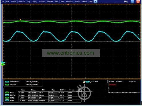 下圖為艾德克斯IT8800模擬LED燈測(cè)試LED恒流源時(shí)的波形圖: