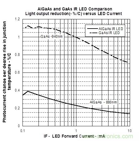 在 1mA 下工作時,GaAs IR LED 光輸出減少 1%/°C。 這意味著結(jié)溫升高 50 °C 時,LED 的輸出會降低 50%。 使用 AlGaAs IR LED,光輸出僅降低 0.225%/°C,因此,結(jié)溫升高 50°C 而光輸出僅降低 11%。