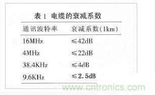 導(dǎo)線的電阻對(duì)信號(hào)的影響很小,可以忽略不計(jì)。電纜的分布電容C主要是由雙絞線的兩條平行導(dǎo)線產(chǎn)生。信號(hào)的損失主要是由于電纜的分布電容和分布電感組成的LC低通濾波器。通訊波特率越高,信號(hào)衰減也會(huì)越大。常規(guī)電纜的衰減系數(shù)見(jiàn)表1。