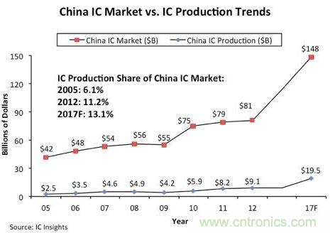 但依然可以看出,中國IC市場和中國本地制造IC還是存在一個明顯的區(qū)別。正如IC Insights所說,雖然自2005年來,中國就成為集成電路最大消費國,但這并不必然意味著中國IC產量將同現在一樣永遠持續(xù)增加。