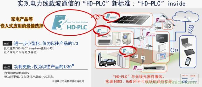 “HD-PLC”inside是最適合利用已有電力線的、作為高速電力線載波通信方式之一而備受矚目的“HD-PLC”的嵌入的標(biāo)準(zhǔn),該標(biāo)準(zhǔn)通過嵌入白色家電、HEMS、BEMS以及HAN相關(guān)設(shè)備等,可將電力線作為通信網(wǎng)絡(luò)使用。新標(biāo)準(zhǔn)產(chǎn)品搭載了間歇動作功能,與以往的PLC產(chǎn)品相比,可進(jìn)一步大幅降低功耗。