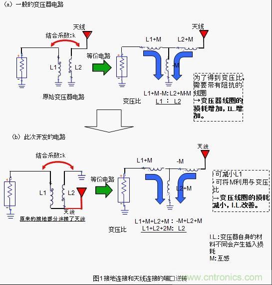 為了削減這種阻抗成分并維持變壓比,我們采用了圖1所示的高頻變壓器的構(gòu)造。該構(gòu)造跟普通的變壓器構(gòu)造相反,它將接地連接端口跟天線連接端口完全逆反。因此,才能達(dá)到如圖1所示的變壓比。使用該構(gòu)造的話,因結(jié)合產(chǎn)生的互感M值會(huì)反應(yīng)到變壓器,變壓器中使用的線圈L值會(huì)減小,由于高頻變壓器的阻抗成分I.L.可以被抑制得很小。